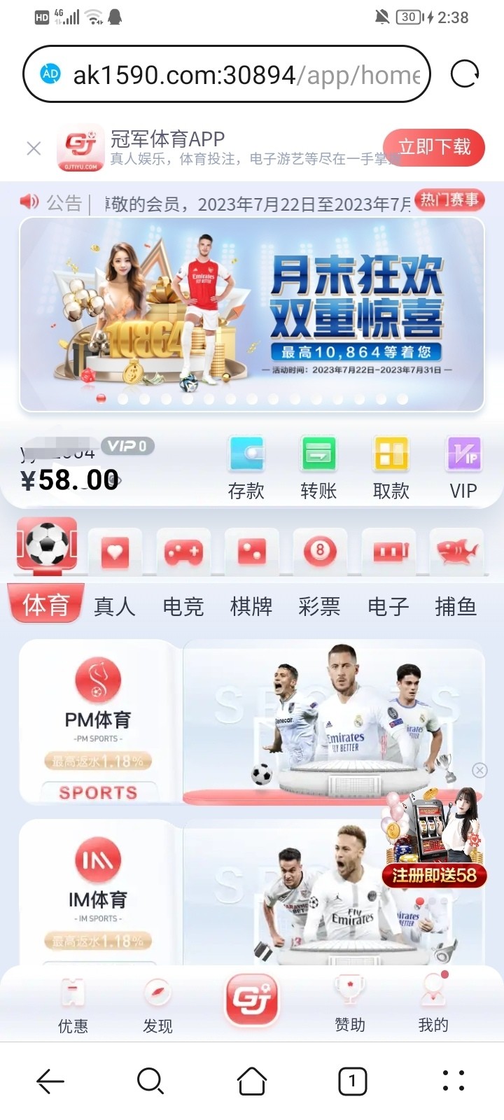 注册绑定姓名手机号码与银行卡 优惠里找到开业大庆典 申请58元 6倍流水 申请后48小时内送到福利中心领取 没有无视  跟完美体育差不多  禁止充值!