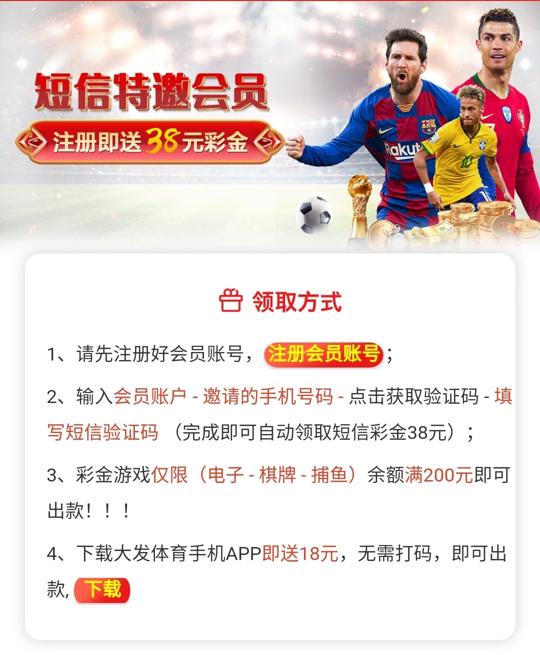 特邀碰瓷,可以先去链接里的自助领取彩金,输入手机号获取验证码,看看能不能收到验证码,能收到说明可以领之后在再注册领取38,收不到无视即可。禁止充值,白嫖就好。