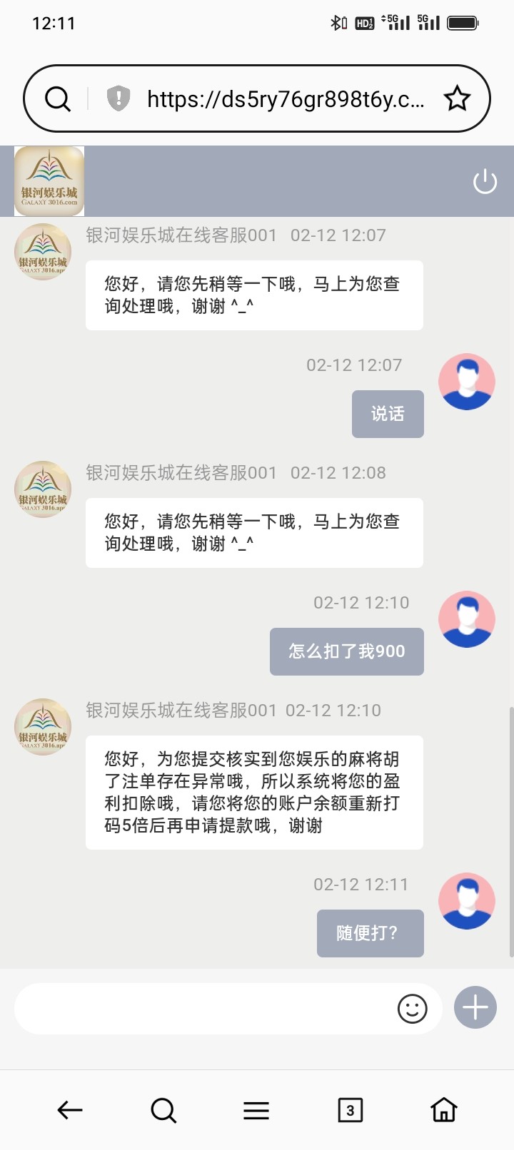 3016银河也是个杂种,博大连出4天,看我一直盈利,今天裸了500提1400给我黑了,说我一直打麻将算违规,不准我打麻将