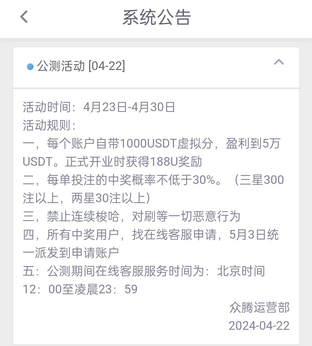 注册体验金1000u,盈利到50000u下分188u