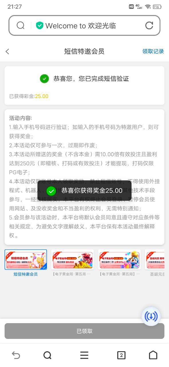 绑定手机号自助领取,不是特邀的还有一个APP下载彩金,特邀彩金10倍流水限制pg电子,没有的无视就行