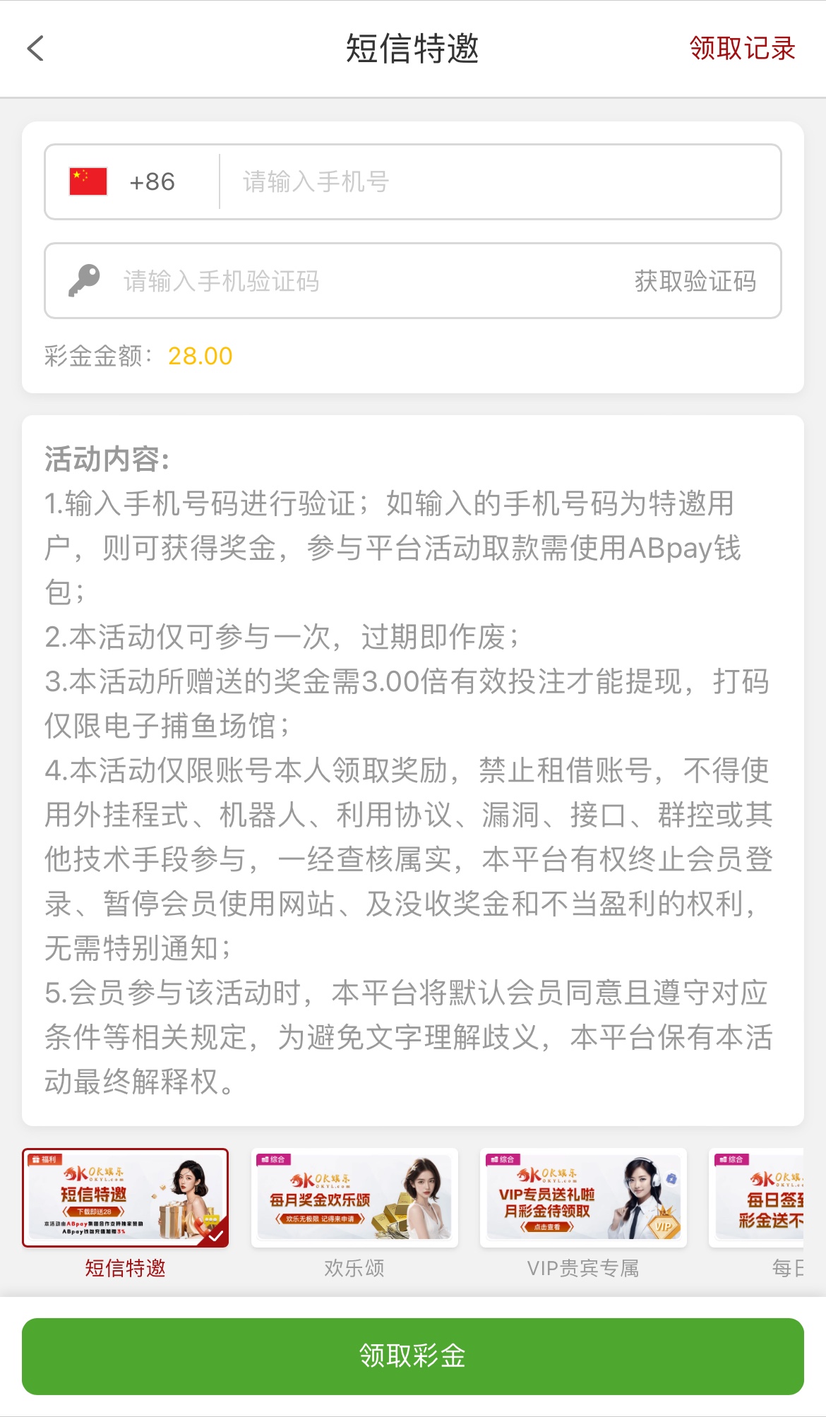 碰瓷短信特邀,下载APP注册送28彩金,彩金3倍流水,限电子捕鱼,只能用abpay钱包取款