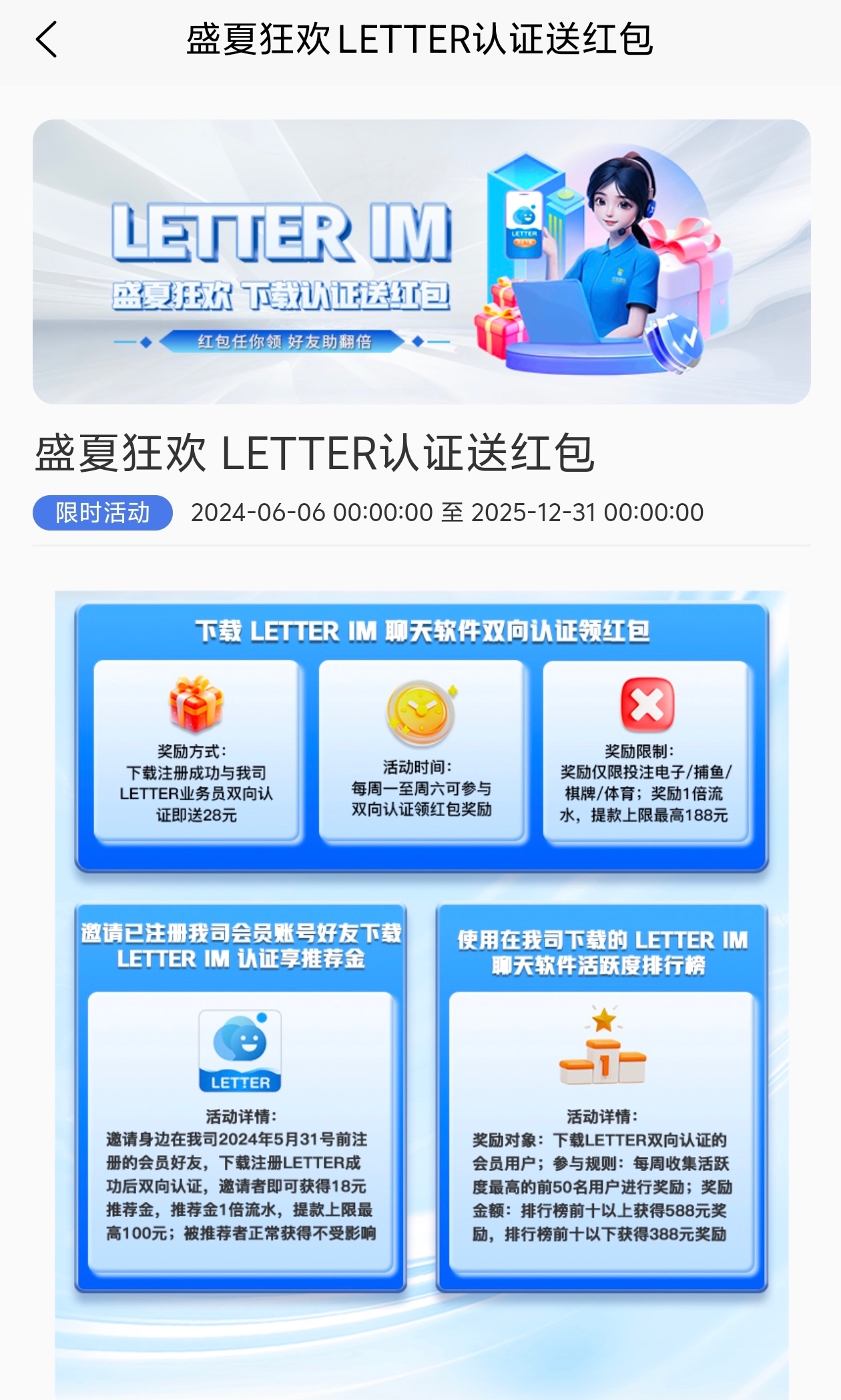 历史充值100+老用户下载letter软件找专员申请双向认证彩金28