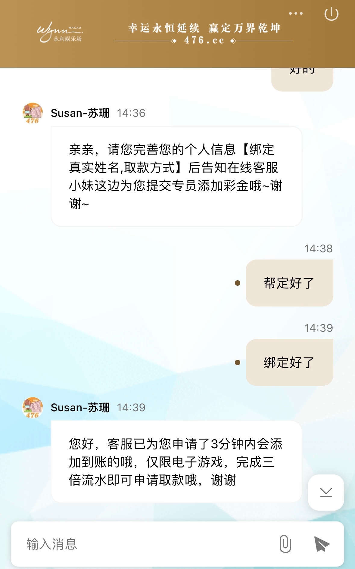 有漏接电话的兄弟可以去碰瓷试试,注册完善资料绑定提款方式,联系客服申请,彩金三倍流水,仅限电子,最低10提款