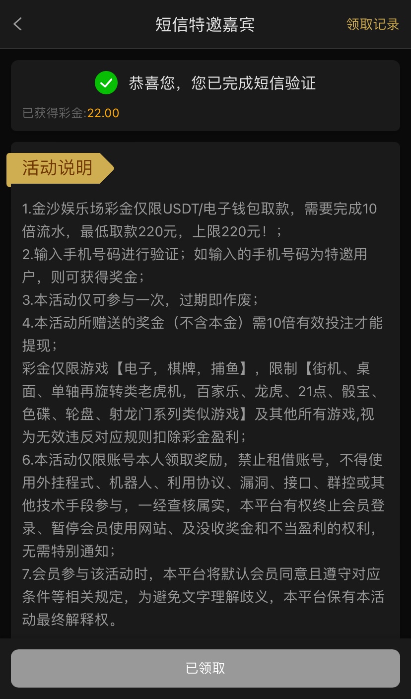 注册完善资料在优惠里找到短信特邀自助领取,10倍流水,仅限电子棋牌捕鱼,最高低220提款