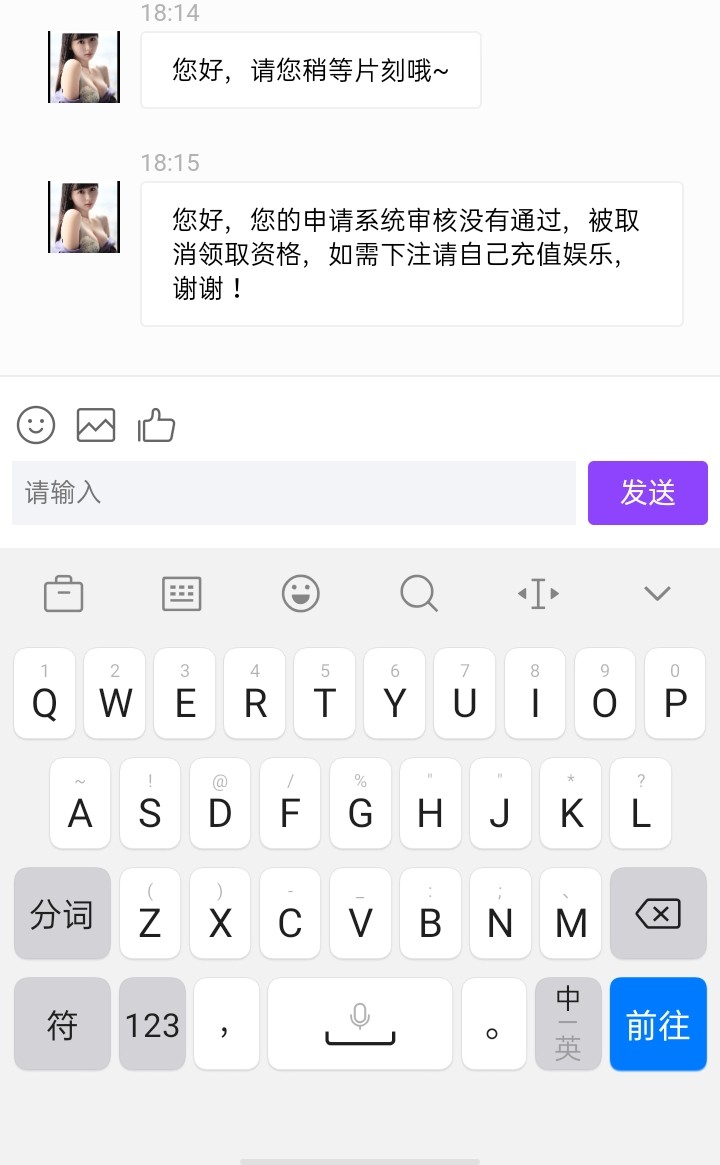您好,您的申请系统审核没有通过,被取消领取资格,如需下注请自己充值娱乐,谢谢!