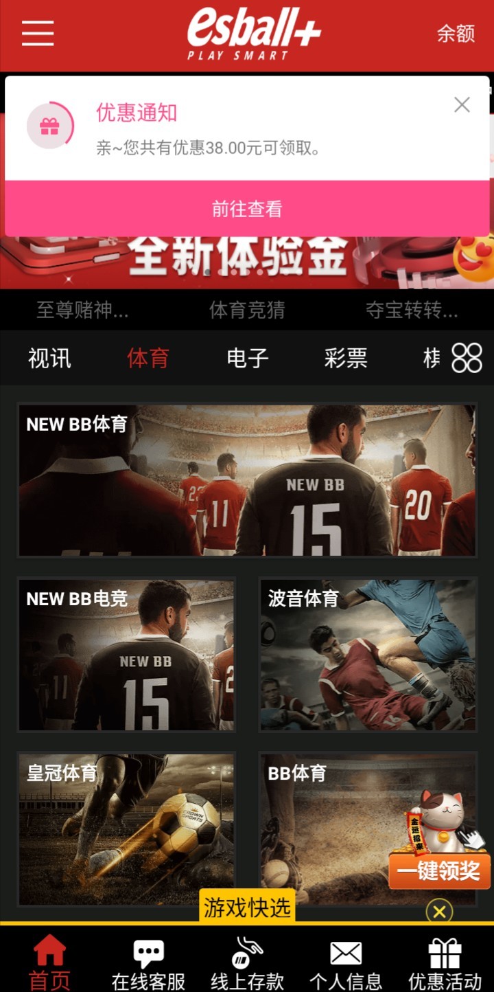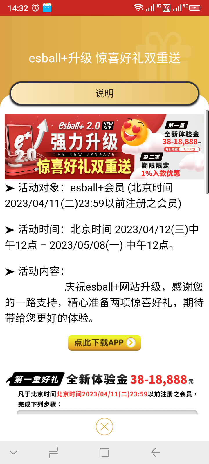 esball老牌公司了,4.11号之前注册的会员,下载APP 设置双重验证即可申请38-18888全新体验金。